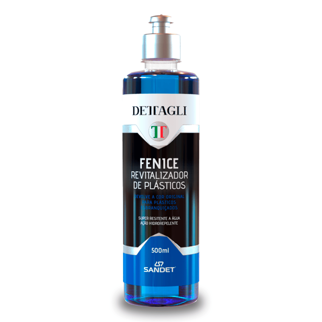 FENICE Revitalizador de Plásticos 500ml DETTAGLI é o produto completo para estética automotiva que restaura, protege e embeleza plásticos ressecados, esbranquiçados e desgastados. Com proteção UV e ação hidrorrepelente, garante durabilidade, brilho intenso e manutenção de superfícies plásticas sem pigmentos ou manchas. Sua fórmula avançada forma uma película protetora resistente à água, renovando a cor e prolongando a vida útil de plásticos, borrachas e pneus. Aroma agradável de melão e resultados profissionais em cada aplicação.