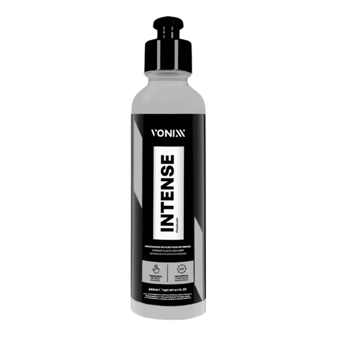 Intense é um renovador de plástico com proteção UV, cuja fórmula balanceada promove acabamento natural e toque seco, com durabilidade de 6 meses. O produto deve ser utilizado especificamente na parte interna do automóvel, em superfícies como vinil e plástico em geral.
