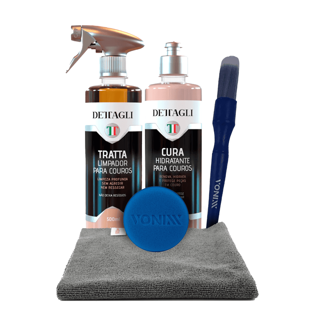 CURA Hidratante de Couros 500ml DETTAGLI é o produto ideal para estética automotiva, renovando a aparência e proporcionando maciez aos bancos e peças de couro, protegendo-os e prolongando sua vida útil. Sua fórmula balanceada contém óleo mineral que nutre profundamente as fibras, álcoois que garantem penetração eficaz e fragrância exclusiva de cappuccino, oferecendo cuidado completo e toque agradável.