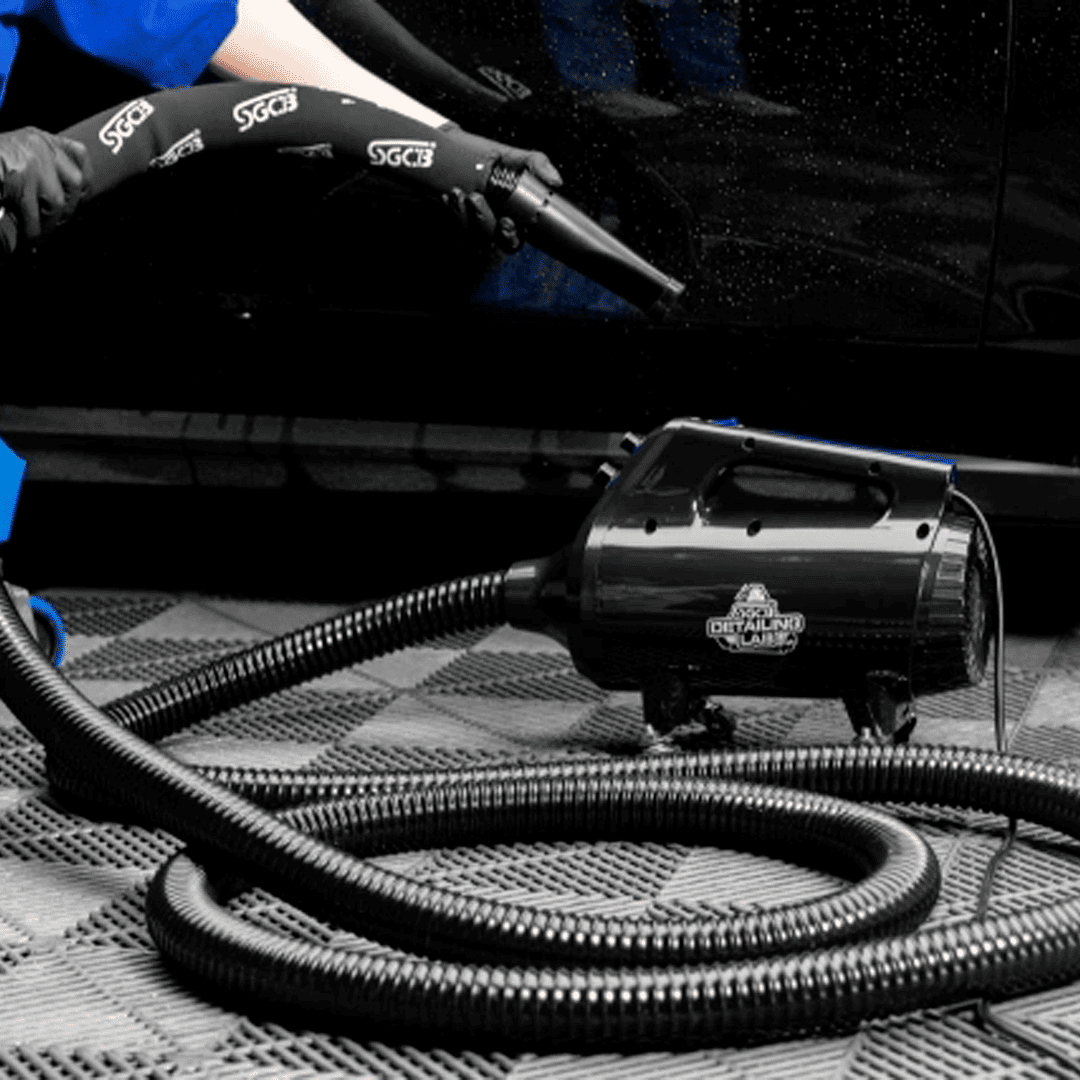O SGCB Air Cannon inclui um conjunto de bocais de borracha, cabo de energia, ventilador e ponteira, além de uma mangueira retrátil de 5 metros, economizando espaço e tornando o processo de secagem muito mais prático no setor de estética automotiva.